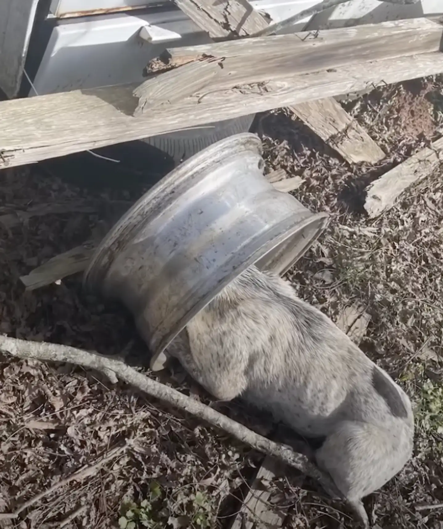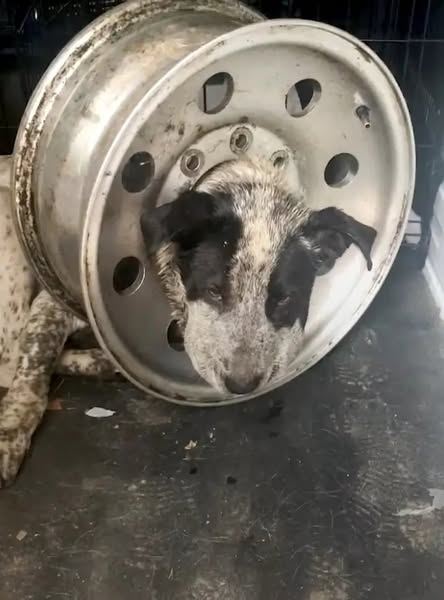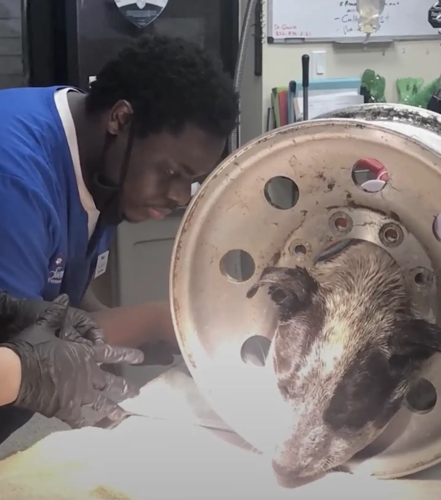 At the veterinary clinic, the staff faced a challenge. Pickles was too scared to allow safe handling, and the metal tire was tightly wedged around his head. Hours passed, and despite the team’s best efforts, it became clear that they needed additional help. The fire department was called in, arriving with specialized tools and calm, steady hands. With precision and care, they began to cut through the metal, aware that the dog’s trust was fragile and every sound, movement, or vibration could frighten him further.