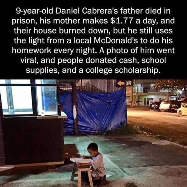In the quiet hum of a small town, 9-year-old Daniel Cabrera turned the harshest circumstances into a story of hope and perseverance. π His life began in hardship: his father passed away in prison, his family was caught in the grip of poverty, and a devastating fire reduced their home to rubble, leaving them with almost nothing. Despite his motherβs relentless work, earning just $1.77 a day, they could barely make ends meet. But even in the face of such overwhelming struggles, Daniel never gave up on his dreams. πβ‘οΈπͺWhile most children his age slept, Daniel would sit alone outside, perched on a small stool beside the road. The glow of a McDonald’s streetlight became his only source of light, and with it, he did his homework, determined to create a better future for himself. There were no study lamps, no electricityβjust hope and an unyielding will to succeed. βοΈπ