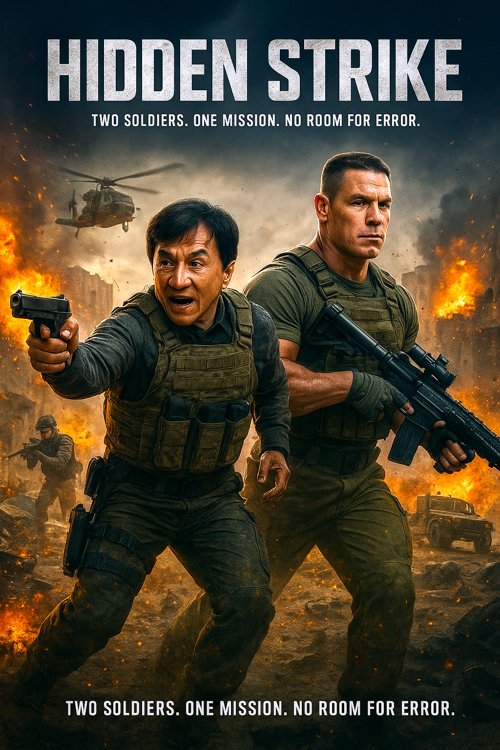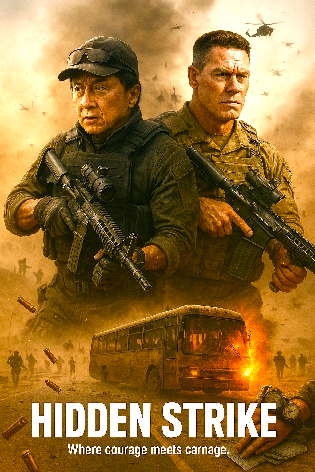 Hidden Strike unites two global action stars — Jackie Chan and John Cena — in a high-octane, buddy-action adventure set in the Middle East. The story follows Dragon Luo (Jackie Chan), a former Chinese special forces soldier leading a private security team tasked with rescuing civilians from a war-torn oil refinery. When he crosses paths with Chris Van Horne (John Cena), an ex-Marine with his own agenda, the two must team up to protect a convoy of refugees and uncover a larger conspiracy behind the chaos.