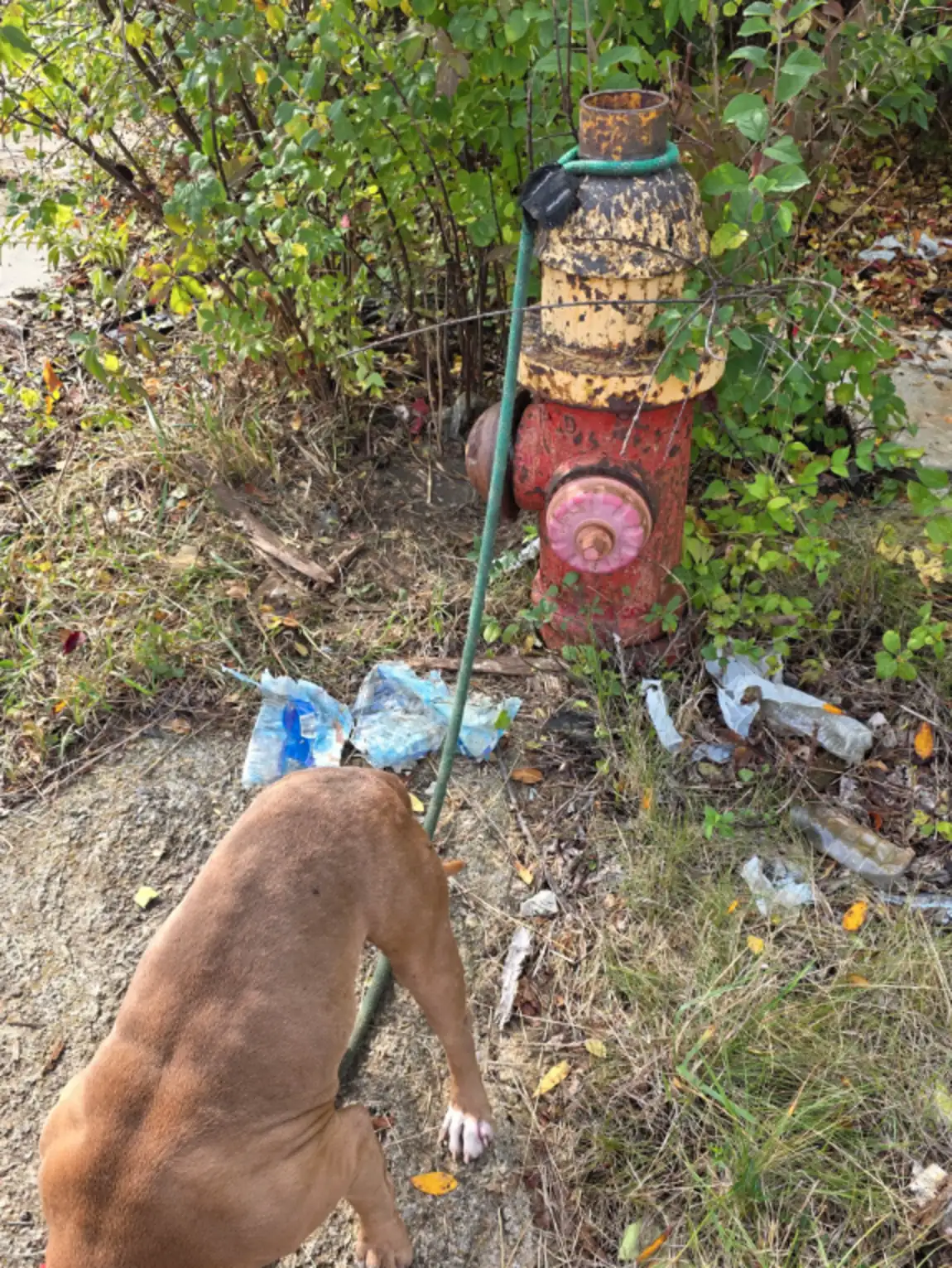 He was tethered to a fire hydrant with a frayed piece of rope, his body trembling from exhaustion. The fur along his spine was thin and patchy, crawling with fleas. He didn’t bark. He didn’t growl. He simply sat there — still, silent, and waiting.