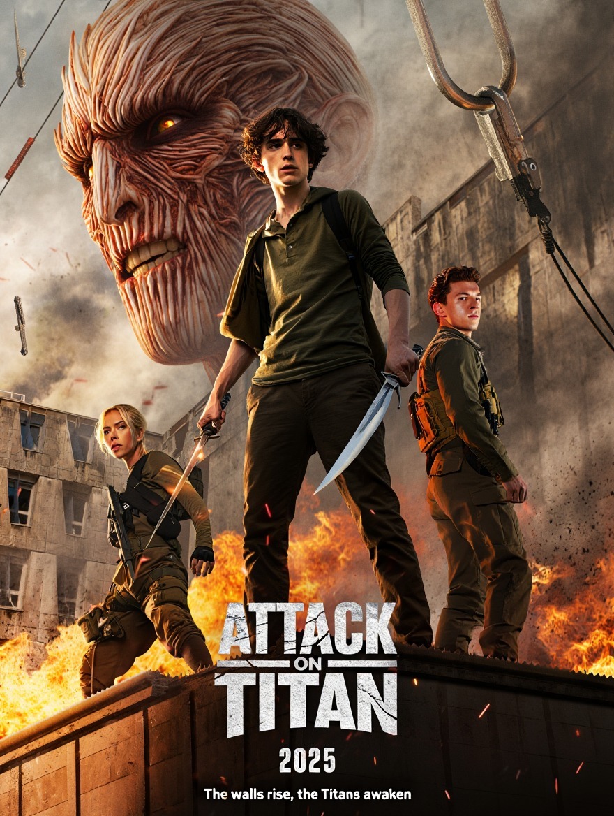 Timothée Chalamet embodies the fiery determination of Eren Yeager, a young man driven by vengeance and the dream of freedom beyond the walls. Scarlett Johansson commands the screen as humanity’s stoic protector, taking on the role of the battle-hardened soldier who shoulders the weight of impossible choices. Joining them, Tom Holland brings heart and courage to the fight as a skilled yet conflicted warrior caught between loyalty and fear.